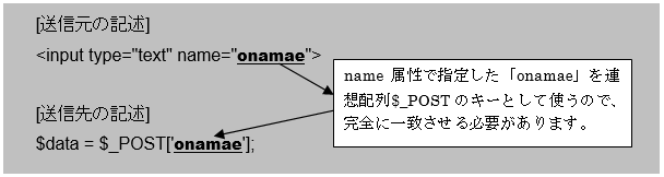- POST送信されてきたフォームデータをPHP側で利用するには、連想配列である$_POSTを利用して行う。