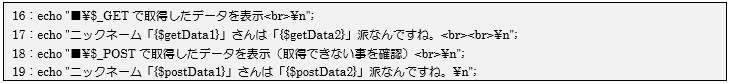画面からのフォームデータを$_GETから各変数に代入した後は、16~19行目で取得した値を画面に表示しています。今回の実行結果からも分かるようにGET送信で送られてきたデータは、PHP側では$_GETを利用して取得でき、$_POSTでは取得できないことが確認できました。