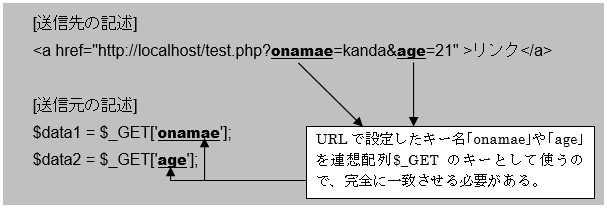 リンクからの送られてくるデータは、「URL?」の後ろからの記述部分が送信データになります。GETデータを利用する場合は「キー名=値」の左辺のキー名が連想配列$_GETで利用する文字列キーに該当します。また取得できる値は、「キー名=値」の右辺側の値になります。