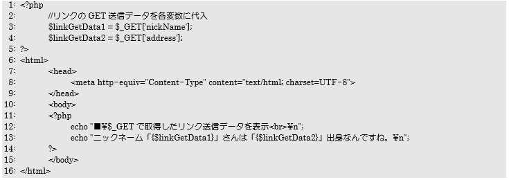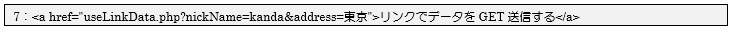 今回は7行目のリンク先を「useLinkData.php」、送信するデータとして「nickName=kanda」と「address=東京」の2つを送信するようになっています。また<a …>~</a>タグで囲まれた文字が画面に表示されるリンク名になります。