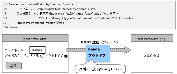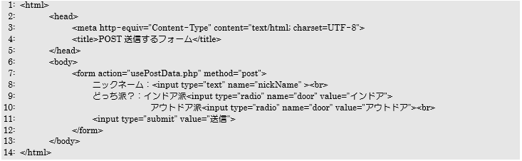 7行目はフォームのデータの送信先を「usePostData.php」、送信方法を「post」で設定しています。