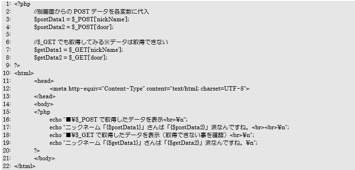 画面からのフォームデータを$_POSTから各変数に代入した後は、16~19行目で取得した値を画面に表示しています。今回の実行結果からも分かるようにPOST送信で送られてきたデータは、PHP側では$_POSTを利用して取得でき、$_GETでは取得できないことが確認できました。
