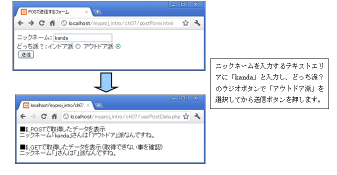 アクセスURL:http://localhost/myproj_intro/ch07/postForm.html