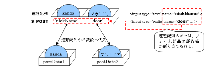 図 7.3.2:連想配列$_POSTから入力データを取得して変数へ代入