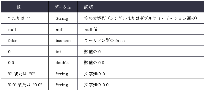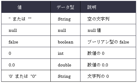 表 9.6.2:偽(false)と判定される値