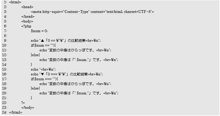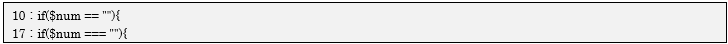 今回のプログラムのポイント10、17行目で、「$num=0」と「””」が等しいかどうかを、比較演算子の「==」と「===」を変えて行っているところです。