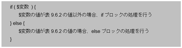 変数の値で判定した場合、表9.6.2で示す値ならelseブロック、それ以外の全ての値がifブロックになります。