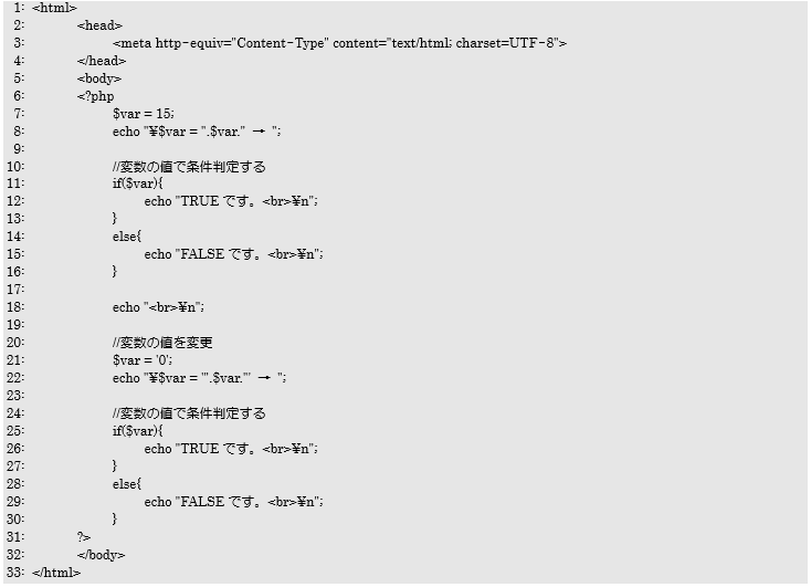 これまでの条件分岐文は、比較演算子を必ず使ってある値と別の値を比較してきました。PHPの条件分岐文では必ず比較演算子を使った条件式ではなく、「値だけで判断」することもできます。