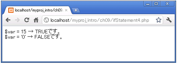 今回の実行結果から、数値の15は「true判定」、表9.6.2で示した値の’0’が「false判定」されているのが正しく確認できました。