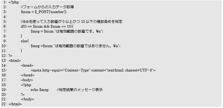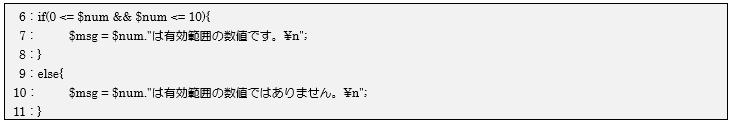6行目のif文は論理演算子の「&&」を使って2つの条件式を組み合わせています。今回の条件式を言葉で表すと「$numの値が0以上、かつ、10以下」となります。つまりは、変数$numに0~10の範囲の数字が入っていればifブロックの処理を行い、そうでない場合はelseブロックの処理を行うことになります。