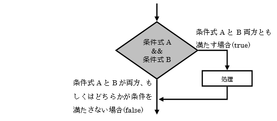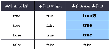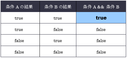 最も少ない条件2つ「条件A && 条件B」の場合を例にすると、条件AもBもtrueの時だけtrueになります。
