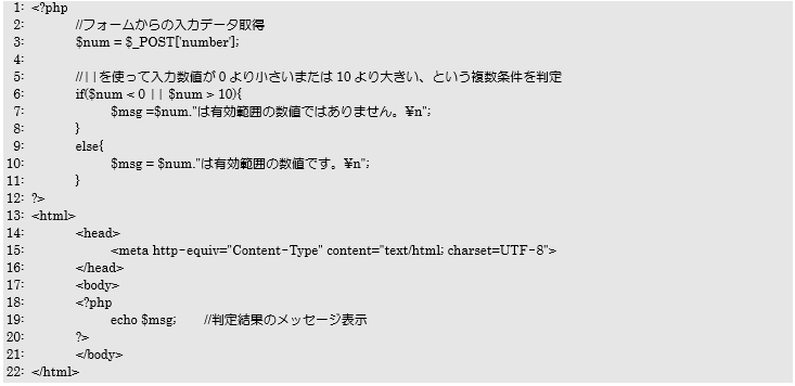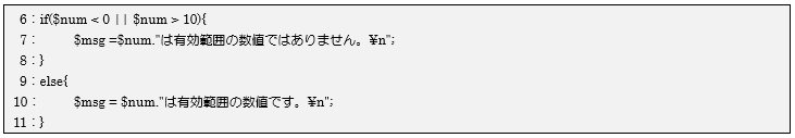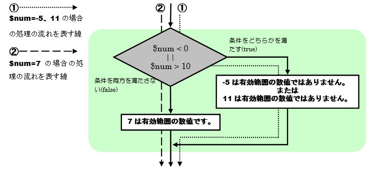 6行目のif文は論理演算子の「||」を使って2つの条件式を組み合わせています。今回の条件式を言葉で表すと「$numの値が0より小さい、または、10より大きい」となります。つまりは、変数$numにマイナスの値か11以上の数字が入っていればifブロックの処理を行い、そうでない場合はelseブロックの処理を行うことになります。