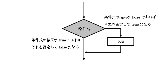 上記の場合、「もしも条件式の結果がtrueなら、その結果は否定されfalseになるので処理は行われない」か、「もしも条件式の結果がfalseなら、その結果は否定されtrueになるので処理を行う」ということになります。フローチャートで表すと以下の図のようになります。