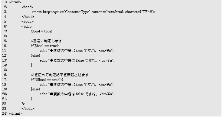 変数の準備が終わった後10~21行目で、2つの条件分岐文を記述しています。その違いはif文の条件式を「!」を使っているかいないかです。