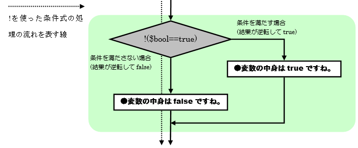 2つ目の条件式は、「!($bool == true)」は条件式「$bool == true」は満たしてtrueですが、「!」で結果を反転させているので「false」となり、elseブロックの処理を行うことになります。これも実行結果から「●変数の中身はfalseですね。」と、変数の値とは逆のメッセージが表示されていてることで確認できます。