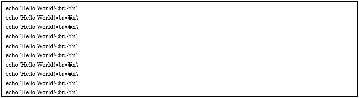 例えば、画面に「Hello World!」を10行表示させたい場合、これまで学習した内容だけでは以下のようなソースコードになります。