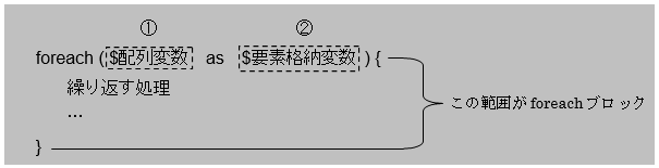 基本的なforeach文は凡例で示した形になります。上記書式の①は必ず配列変数(凡例では$data)を使用し、②では順次取り出される要素の値を代入する要素格納用変数(凡例では$value)を使用します。要素格納用変数の変数名は任意に指定できます。