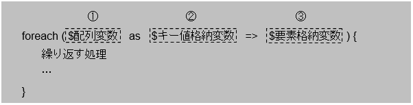 前項の構文その1と比べて①と③は同じですが、②のキー値を格納する変数の設定が増えています。②と③の間はarray関数で連想配列キーを設定したのと同じように、「=>」を記述します。また②のキー値格納変数は③と同じで任意の名前を指定します。