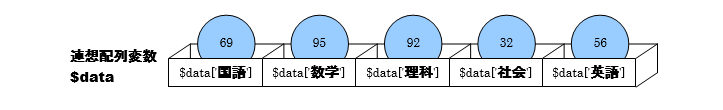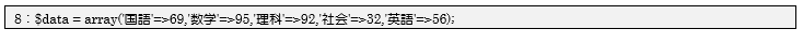 ここでの処理のポイントはforeach文を利用すると、連想配列1つで2グループのデータ(教科名と点数)を1セットで扱えることです。