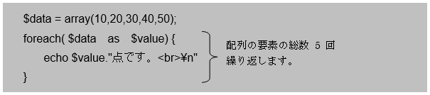 - foreach文を使うと配列の数だけ繰り返し、要素の値を順次処理することができる。