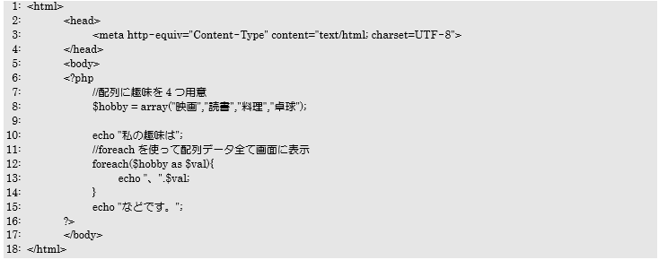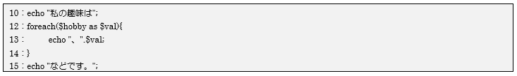 12~14行目がforeach文で、繰り返す対象の処理は13行目の「、と各ループ毎の要素の値」を画面に出力することになります。