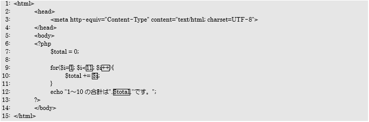 ④ $i:1~10の総和を求める必要があるので、$totalに加算代入するものは$iになる。