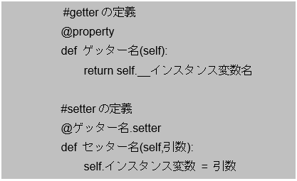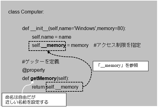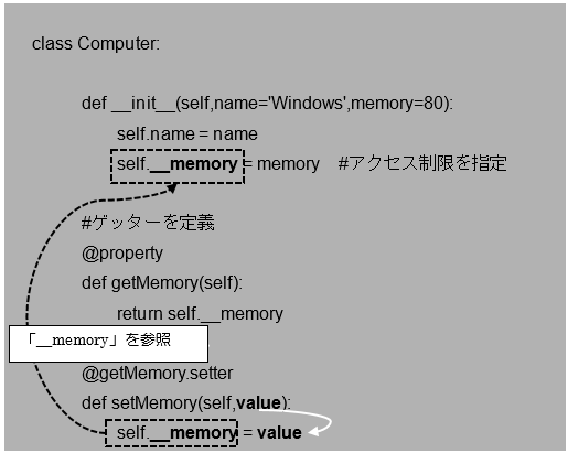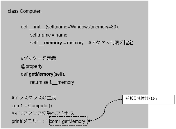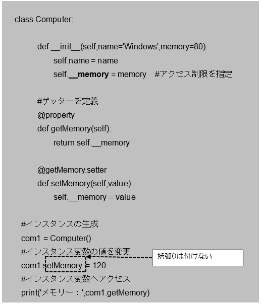 [python] class Computer: def __init__(self,name=’Windows’,memory=80): self.name = name self.__memory = memory #アクセス制限を指定 @property def getMemory(self): return self.__memory @getMemory.setter def setMemory(self,value): if value >= 100: self.__memory = value else: self.__memory = 100 #インスタンスの生成 com1 = Computer() com1.setMemory = -30 #インスタンス変数へアクセス print(‘com1のメモリー:’,com1.getMemory,’GB’) [/python]