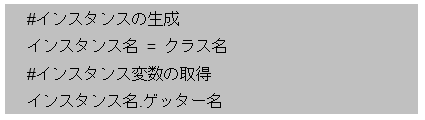 またgetterメソッドを介してインスタンス変数の値を取得するには、インスタンスを生成し、「インスタンス名.ゲッター名」と記載することで取得できます。
