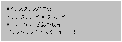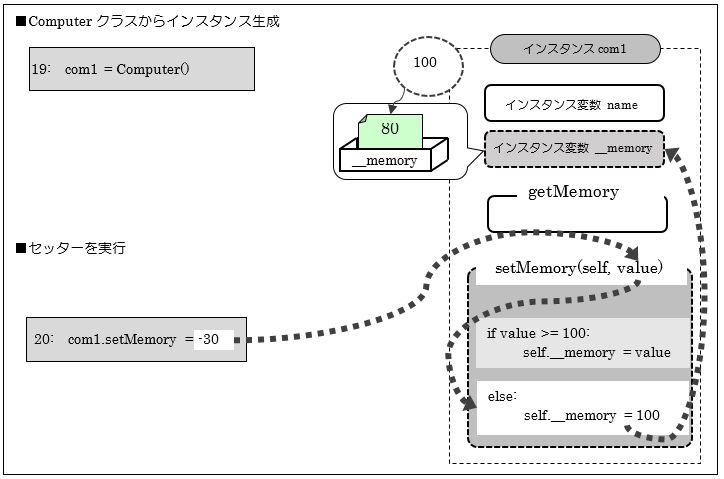 [python] #インスタンスの生成 com1 = Computer() com1.setMemory = -30 [/python]