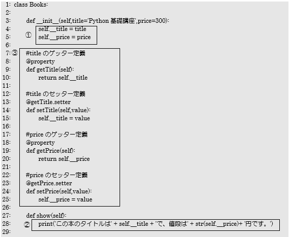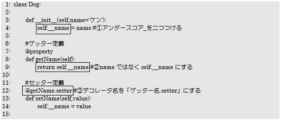 ① 各インスタンス変数の頭文字に「__(アンダースコア2つ)」を追加
