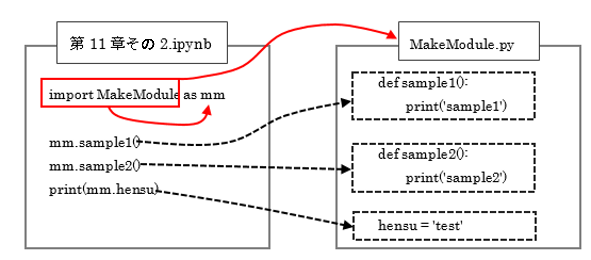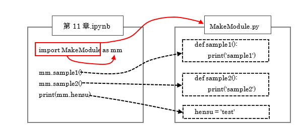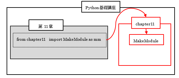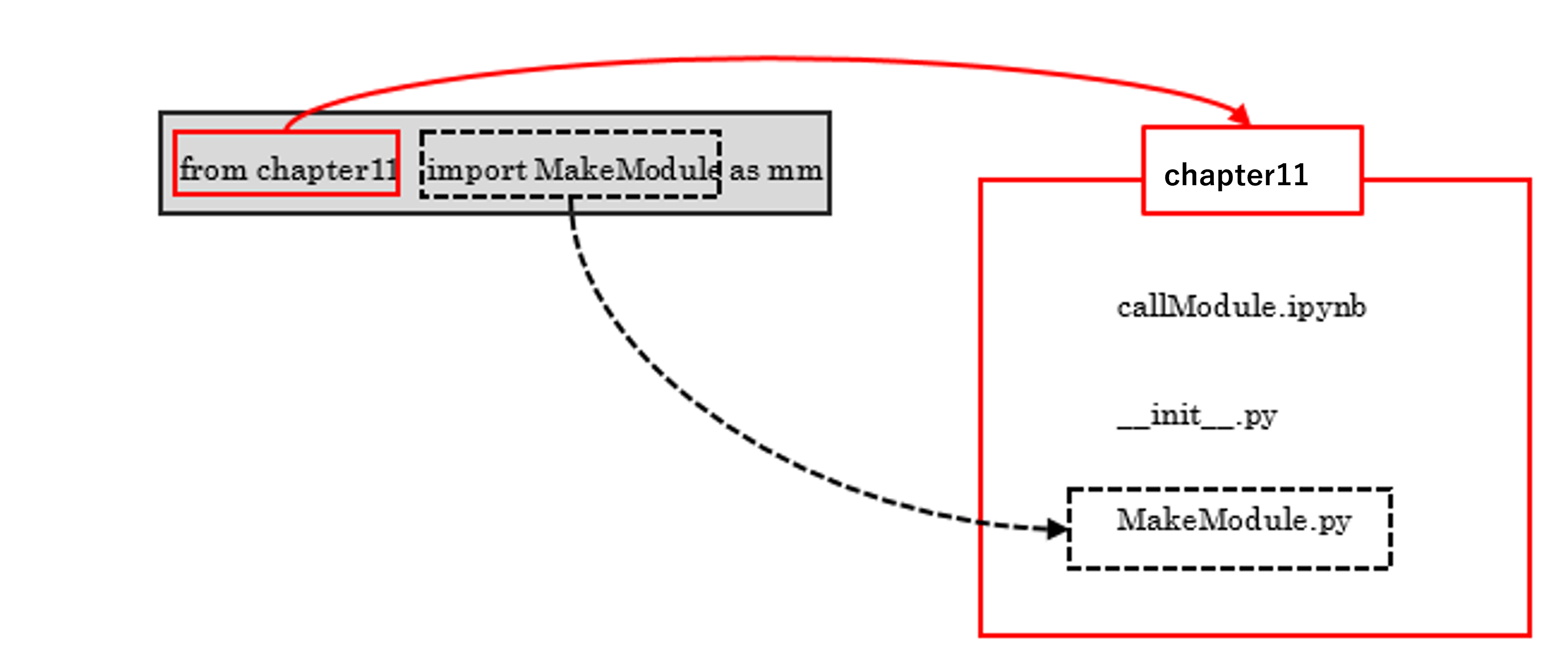 [python] from chapter11 import MakeModule as mm [/python]「 from chapter11」となっているので、呼び出し先が「chapter11」パッケージの中にあるモジュールに限定されてます。