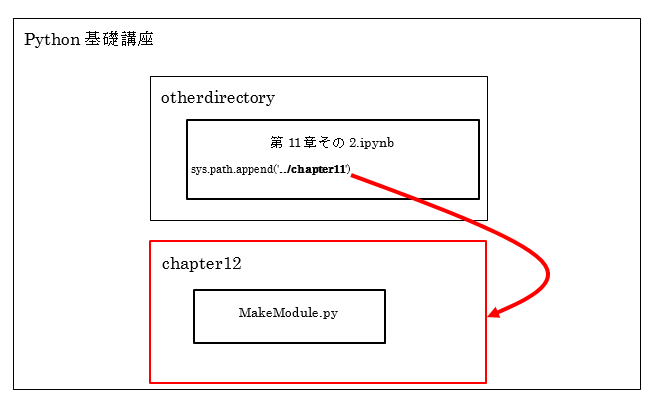 凡例:「Python基礎講座/otherdirectory/」から「Python基礎講座/chapter11/MakeModule.py」の呼び出す