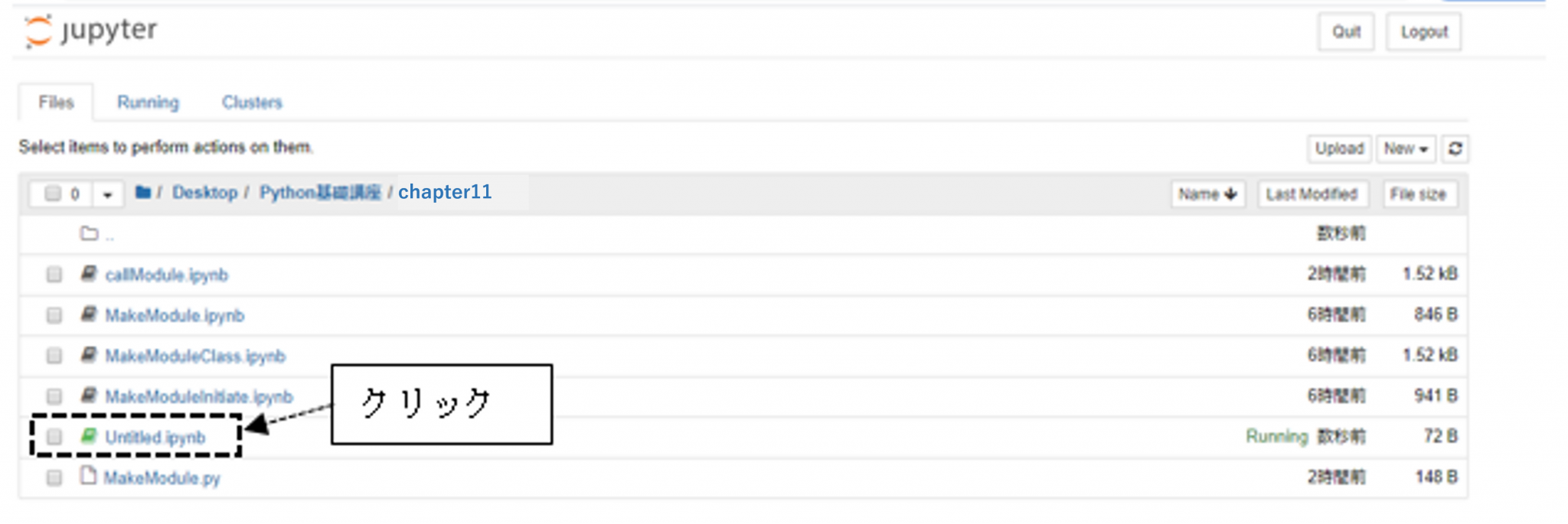 フォルダについては「chapter11//」が既に用意されてますので、当テキストではJupyterNotebookを介して「__init__.py」ファイルの作成方法について解説していきます。