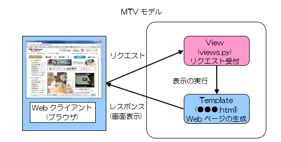 MTVの内、前章までで習ってきたView(V)は特定のアドレスにアクセスした時に最初に呼び出されるもので、このView(Views.py内の呼び出される関数)にてWebページとして表示する内容を決定することができましたが、この時、テキストではなく予め用意したHTMLをWebページとして表示させることができ、この表示用データこそがTemplateということです。