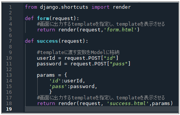 1 「LoginForm」プロジェクト直下、「views.py」に「form」関数、「success」関数を記述