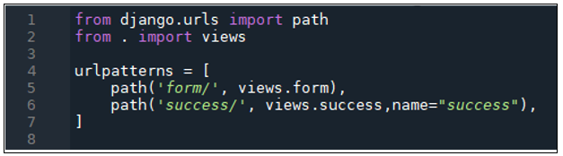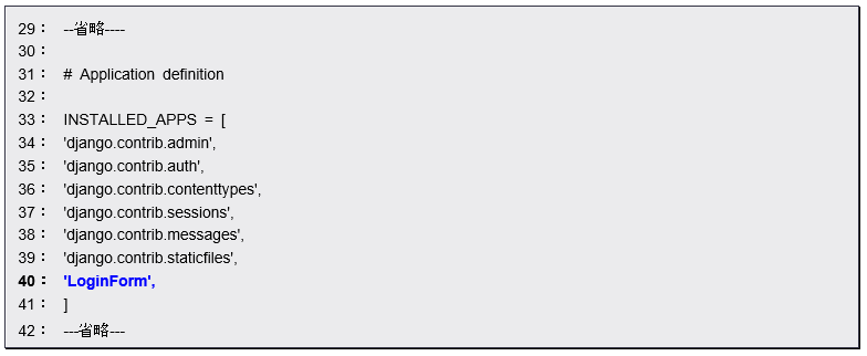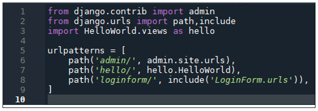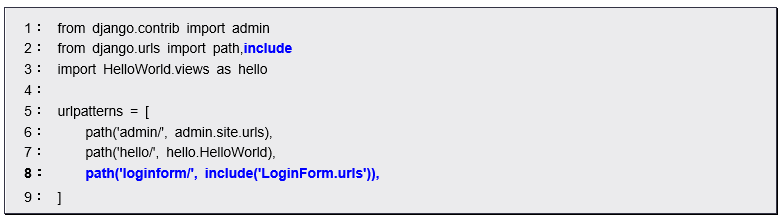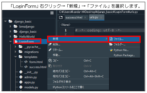 LoginFormプロジェクト直下に作成した「urls.py」に以下に示すソースコードを記述する。