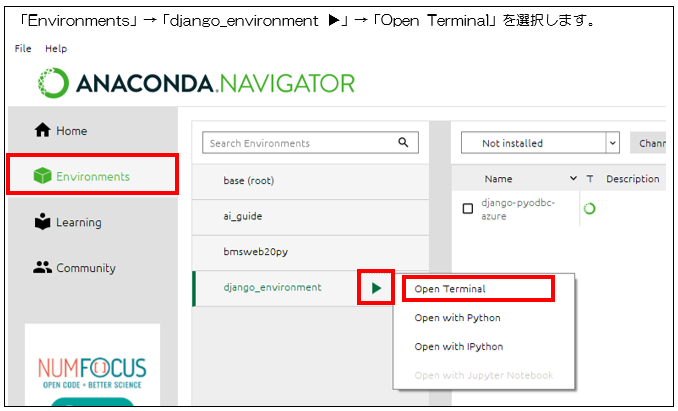 プロジェクトを始めるにあたり、コマンドプロンプトを開きます。「Anaconda Navigater」の「Environments」の「django_environment」の「▶」をクリックし、「Open Terminal」を選択してください。