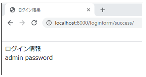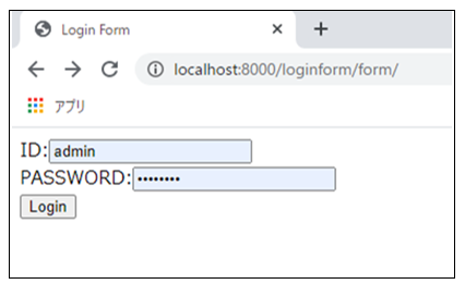 1 アプリケーションにアクセス(ログイン情報入力画面) 以下のアドレスから簡易ログインアプリケーションにアクセスします。 URL:http://localhost:8000/loginform/form/