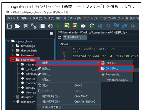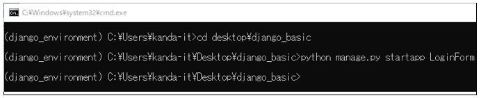 「django_basic」フォルダに移動したら、「LoginForm」プロジェクトを作成します。