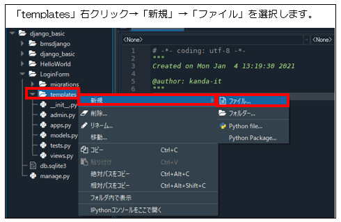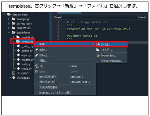1 プロジェクト直下「django_basic/LoginForm」に「templates」フォルダを作成する