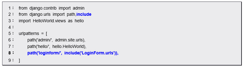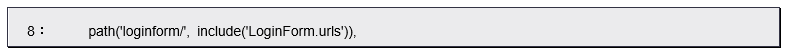 では「LoginForm/urls.py」内のurlpattern内ではどのような処理がなされているのでしょうか。5、6行目に次のように記載されています。