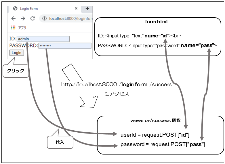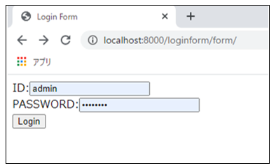 「http://localhost:8000/loginform/form」のWebページ内で「login」ボタンをクリックすると、「http://localhost:8000 /loginform /success」に遷移します。