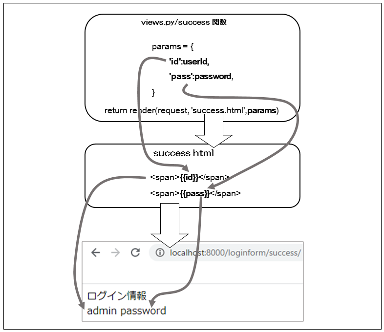 [python] def success(request): #templateに渡す変数を用意 userId = request.POST[“id”] password = request.POST[“pass”] params = { ‘id’:userId, ‘pass’:password, } #画面に出力するtemplateを指定し、templateを表示させる return render(request, ‘success.html’,params) [/python]