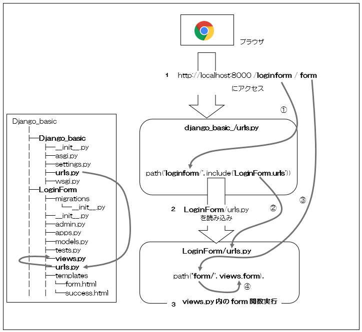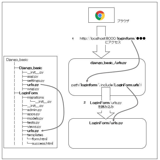 そのため「LoginForm/urls.py」内の処理では、「http://localhost:8000/loginform/」を基準(カレントディレクトリ)に、「…/loginform/」以下の階層を「urlpatterns」内から探します。
