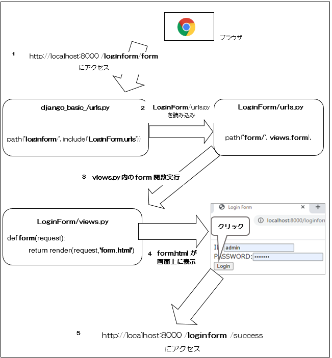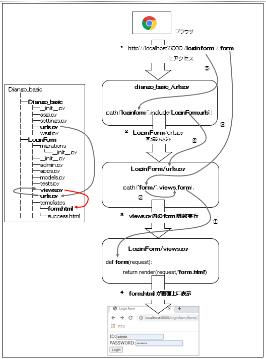 つまりは「http://localhost:8000/loginform/form」にアクセスすると「LoginForm/views.py」の「form関数」が読み込まれるということです。