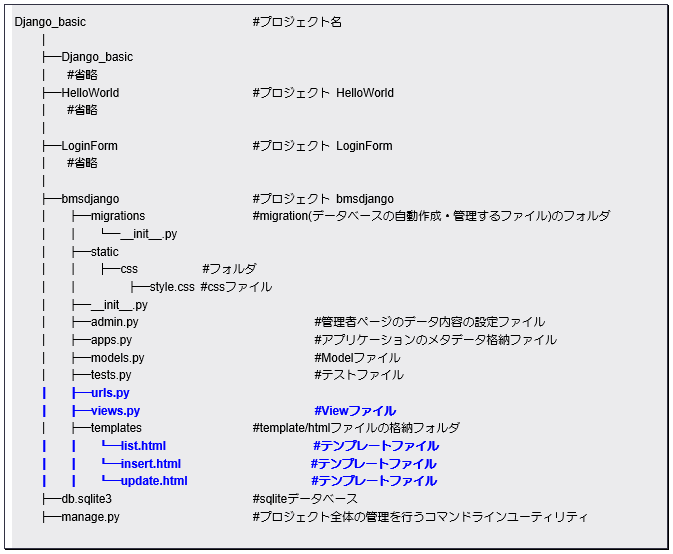 - 「bmsdjango /templates」フォルダ内に「insert.html」、「update.html」を作成
