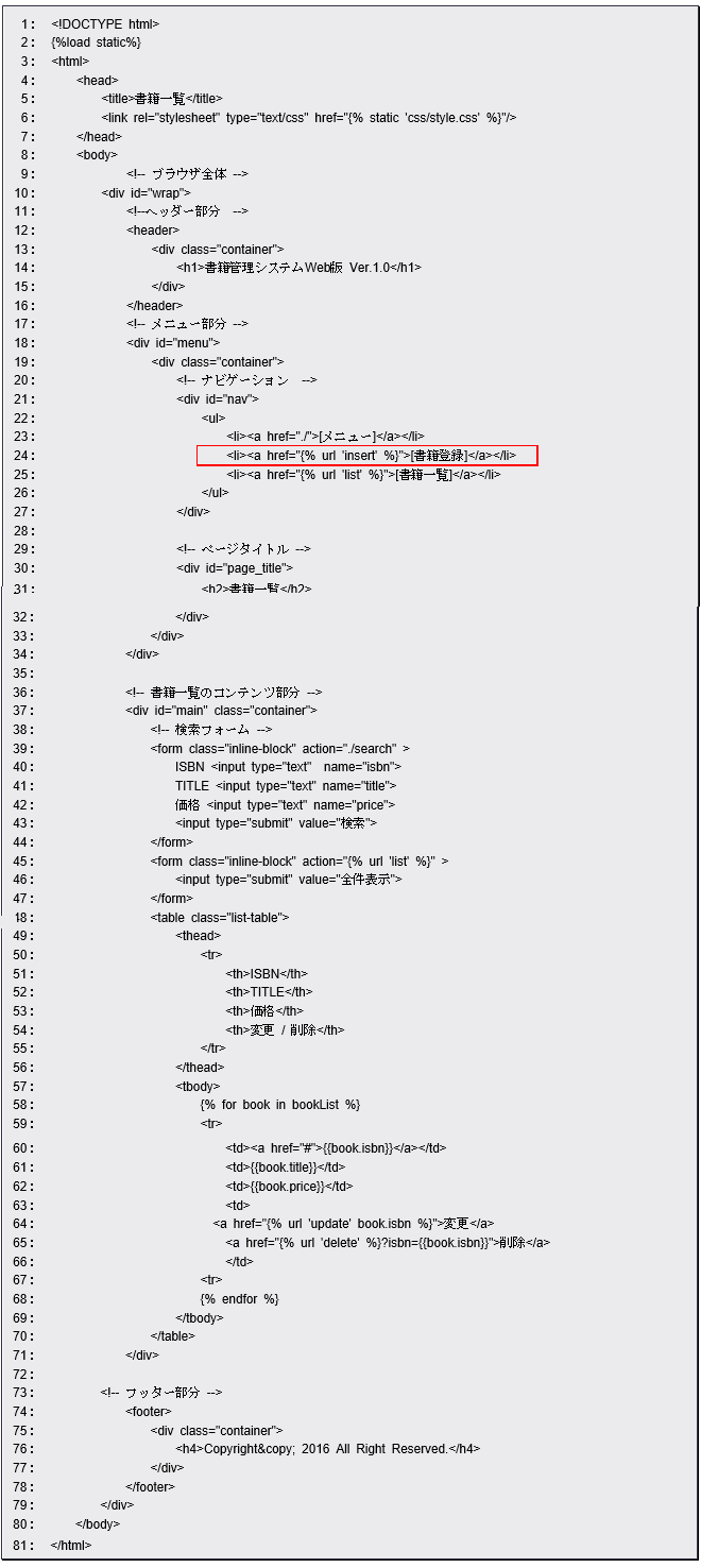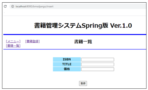 <li><a href=”{% url ‘insert’ %}”>[書籍登録]</a></li>