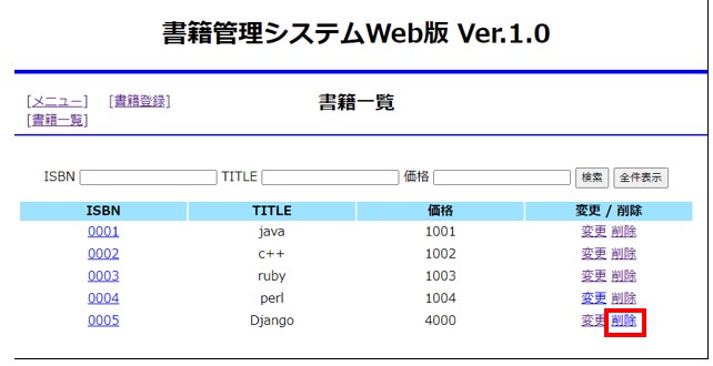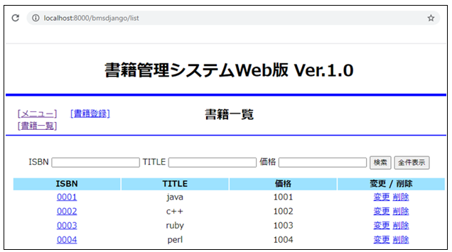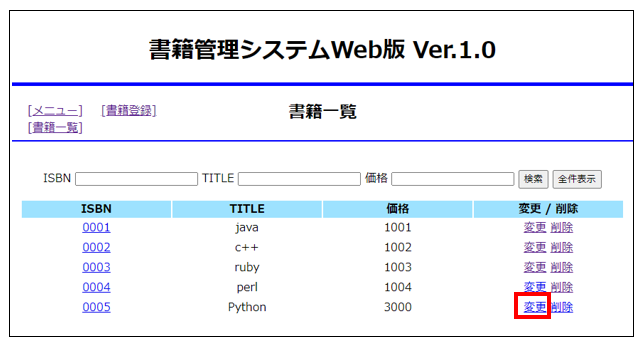 ISBNに「0005」、TITLEに「Python」、価格「3000」を入力し「登録」をクリックします。すると一覧画面に戻るので、今度はPythonの行の変更ボタンをクリックします。