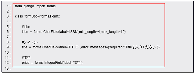 Formとして3~12行目でformBookクラスを定義しており、Formは「django.db.forms.Form」のサブクラスであるため、3行目で「class formBook(forms.Form)」と記載されています。