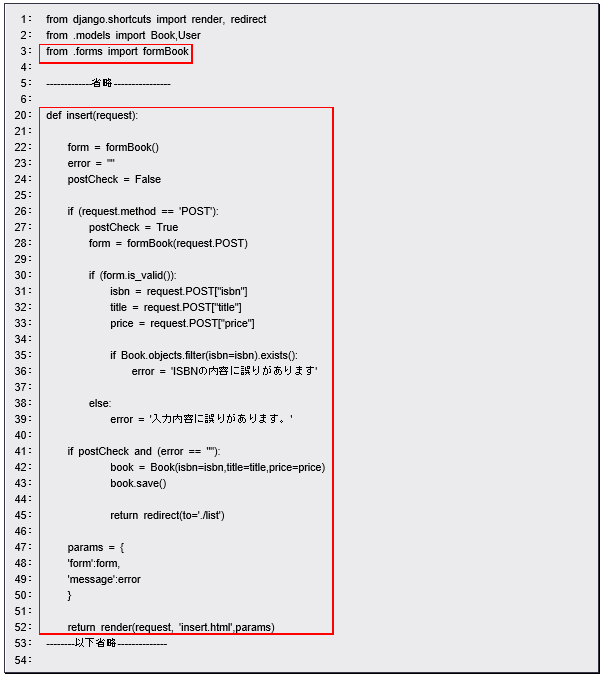 またisbnは一意的な値であるため、35行目ではisbnが既存のデータに重複しているかの判定を行っています。重複があった場合、変数errorに「’ISBNの内容に誤りがあります’」が格納されます。